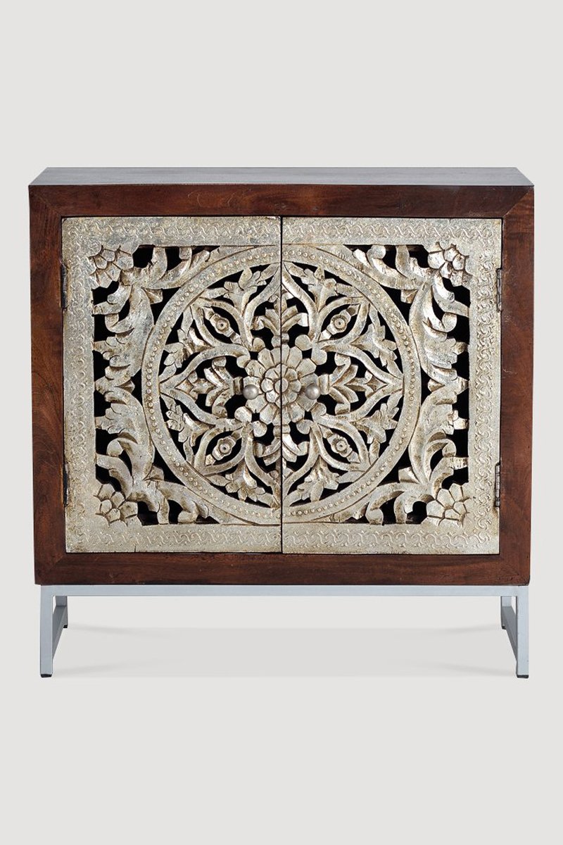 Buffet 2 portes - Naturel et argenté - En bois de manguier - 80 x 35 x 80 cm