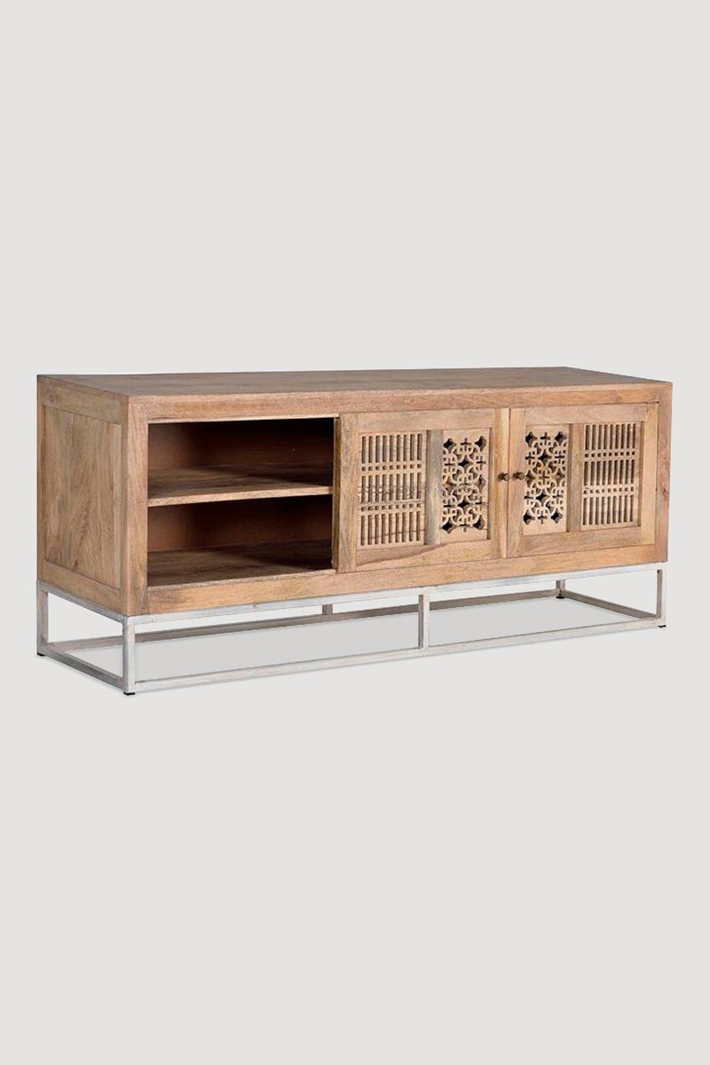 Meuble TV 2 portes - Naturel et argenté - Structure en bois de manguier - 160 x 65 x 40 cm