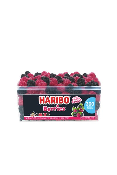 Confiserie en forme de framboise et de mûre (rouge et noire).