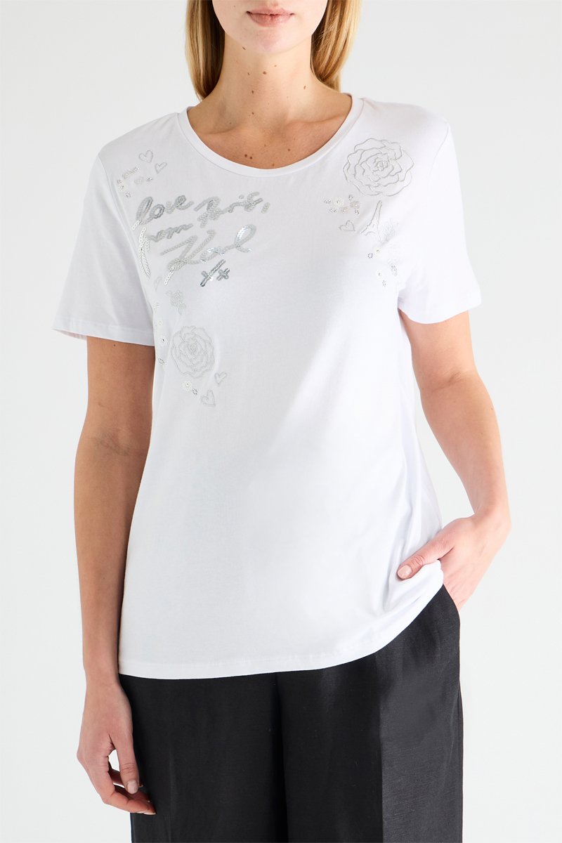 Lettrage et motifs fantaisie à sequins devant.
