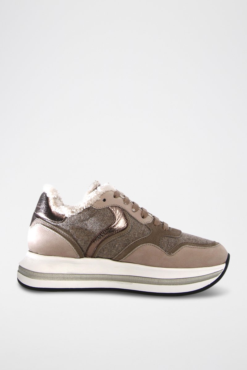 Baskets fourrées en cuir effet métallisé, nubuck et laine.