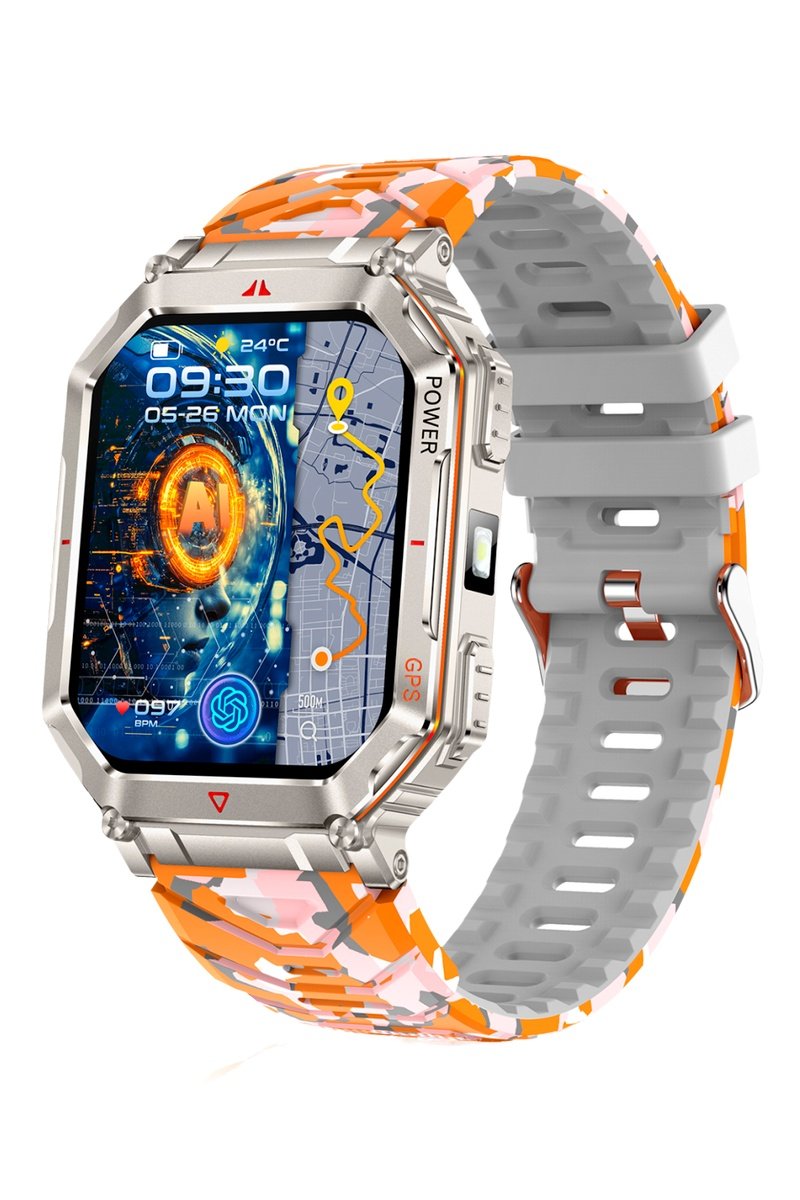 Outils d’exploration : lampe torche tactile (3 modes), baromètre (altitude/pression), boussole, et fonction SOS.
