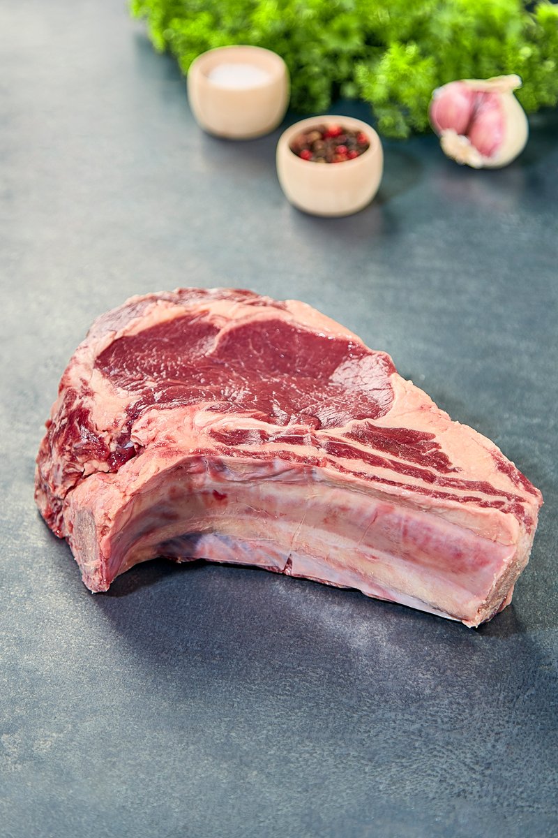 Goûteuse et musculeuse, la côte de bœuf Simmental est d'un grain de viande parfait.