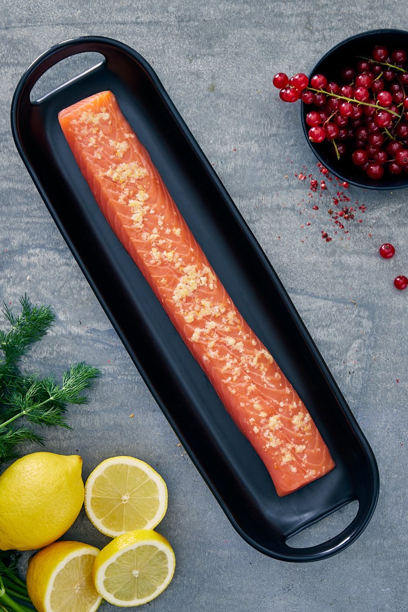 Ingrédients : saumon atlantique (Salmo salar), sel, zeste de citron 1,5%, 0,5% arôme de citron.