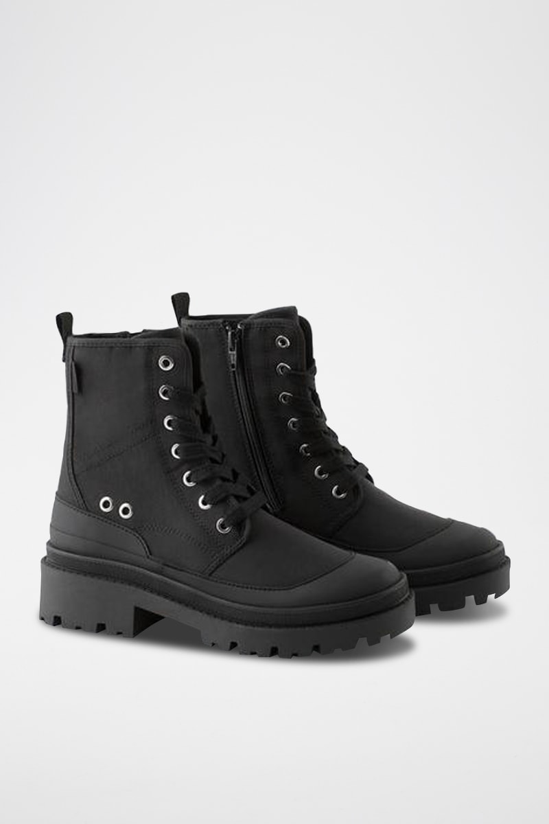 Fermeture à lacets devant et zippée sur le côté.