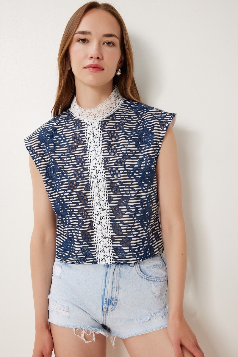 Empiècements en dentelle à l’encolure et devant.