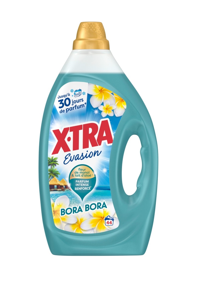 Grâce à son parfum intense et longue durée, la lessive parfumée XTRA Evasion vous transporte vers les plages paradisiaques de Bora Bora à chaque lavage.