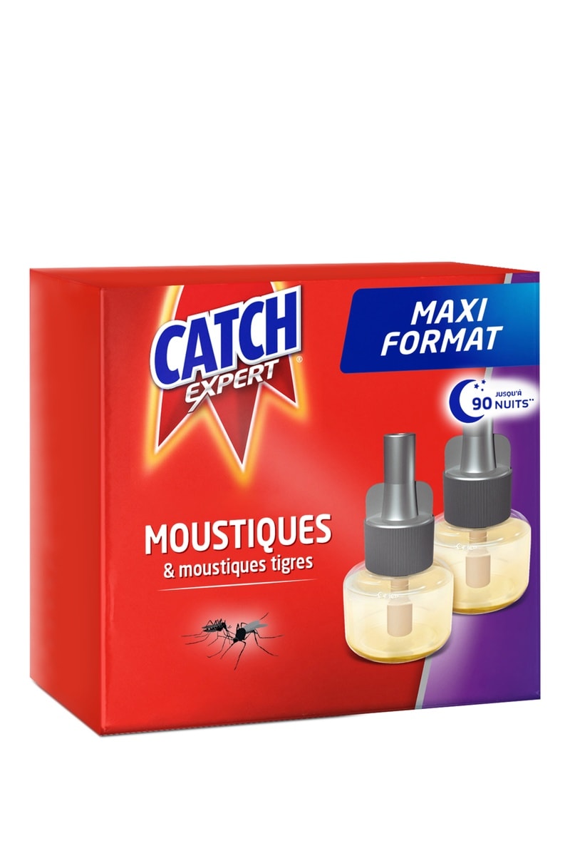 La double recharge liquide pour diffuseur électrique CATCH EXPERT vous protège efficacement contre les moustiques et moustiques tigres jusqu'à 90 nuits (nuits de 8 heures) grâce à sa formule exclusive.