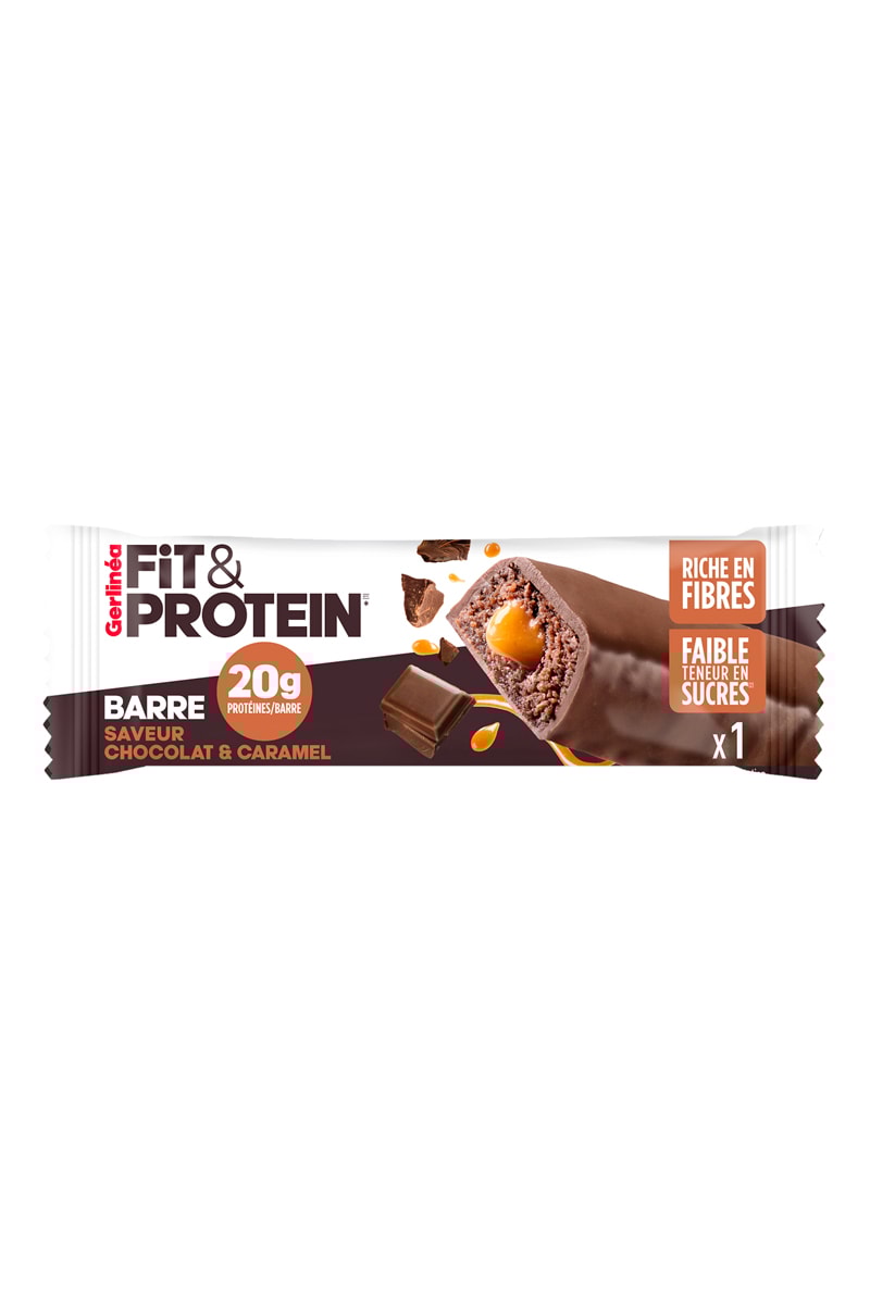 Barre protéinée chocolat caramel.