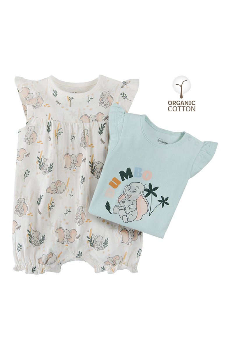 2 barboteuses en coton biologique dont 1 avec fronces devant et au dos Dumbo Disney :