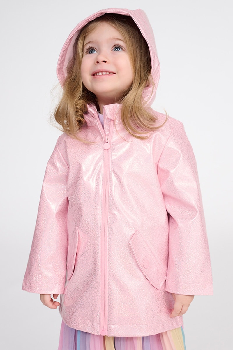 Imperméable à capuche pailleté.