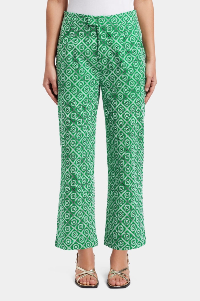 Pantalon straight en broderie anglaise. Empiècement en métal avec logo sur le côté.