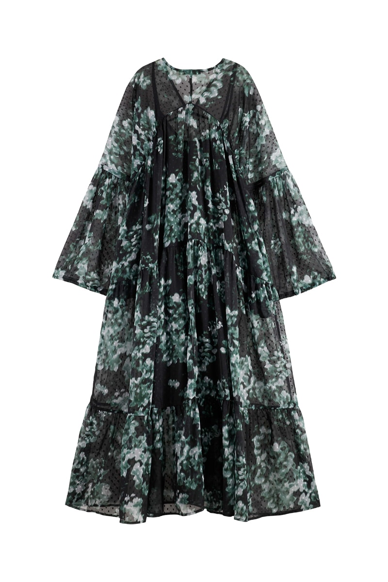 Robe longue à manches longues volantées.