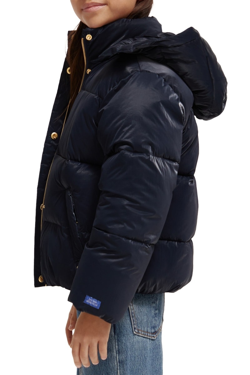 Doudoune à capuche amovible pressionnée.