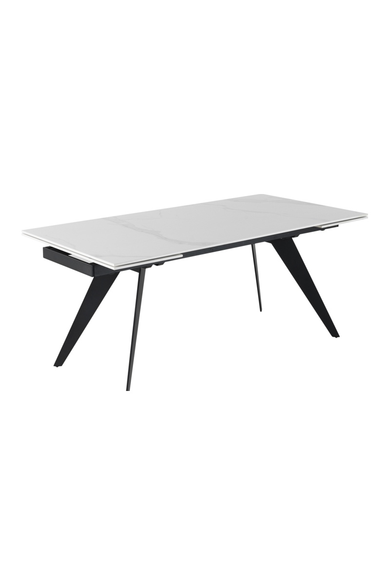 Table à manger extensible 180/260x95 avec système d'ouverture automatique avec plateau en céramique blanche et pieds en métal noir.