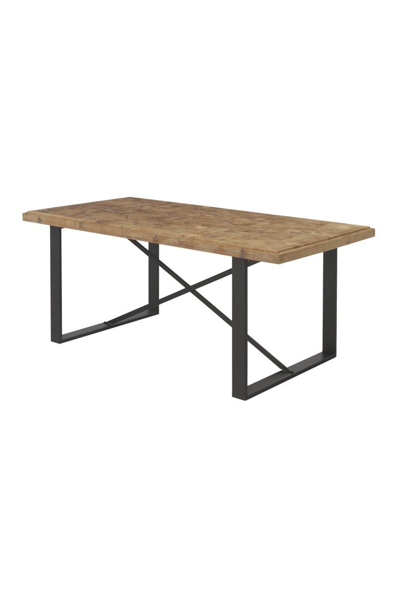Table à manger de 90x182 cm avec plateau formée de blocs carrés en bois de sapin recyclé de couleur naturelle collés géométriquement, les pieds sont en métal de couleur noire.