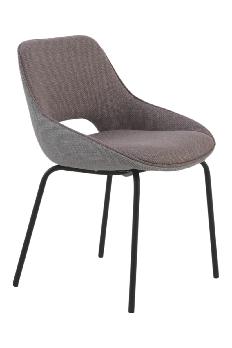 Il s'agit d'un ensemble de 4 chaises tapissées bicolores en grenat et gris, avec des pieds métalliques noirs.