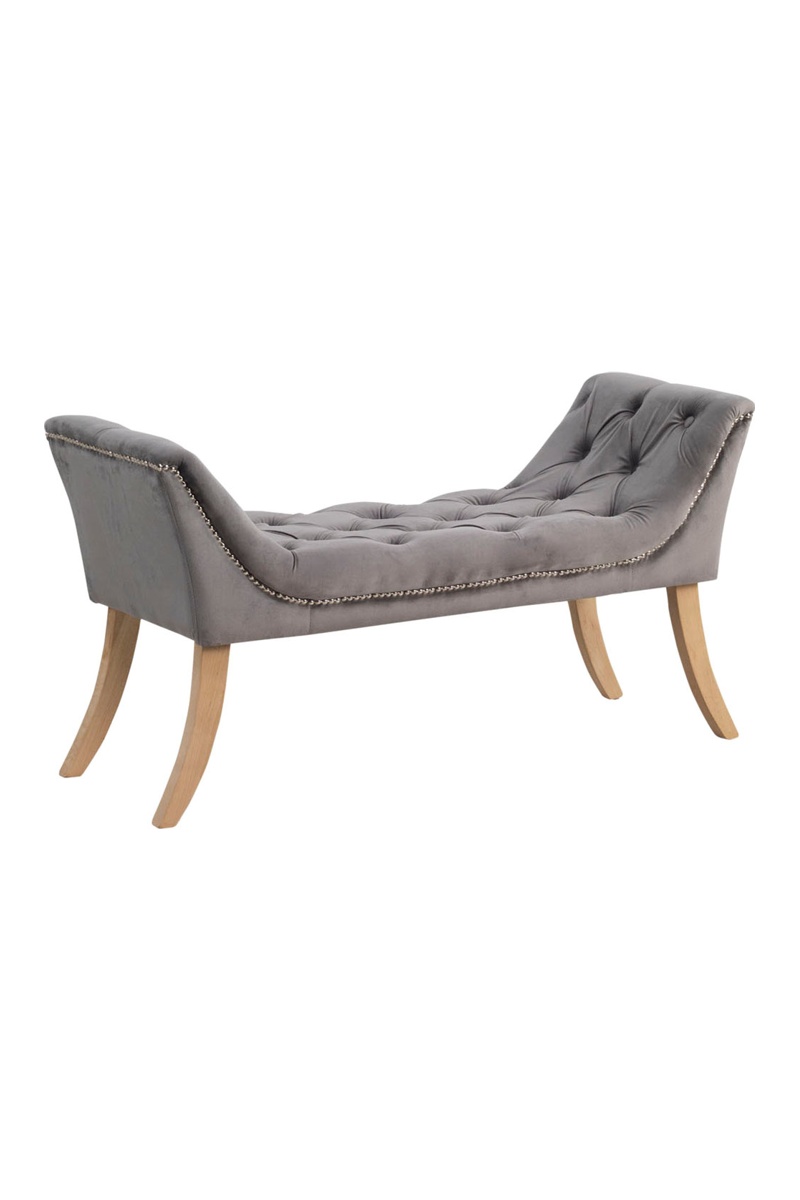Tapissée en velours gris capitonné terminé avec un cordon à rivet argentés et pieds en bois naturel.