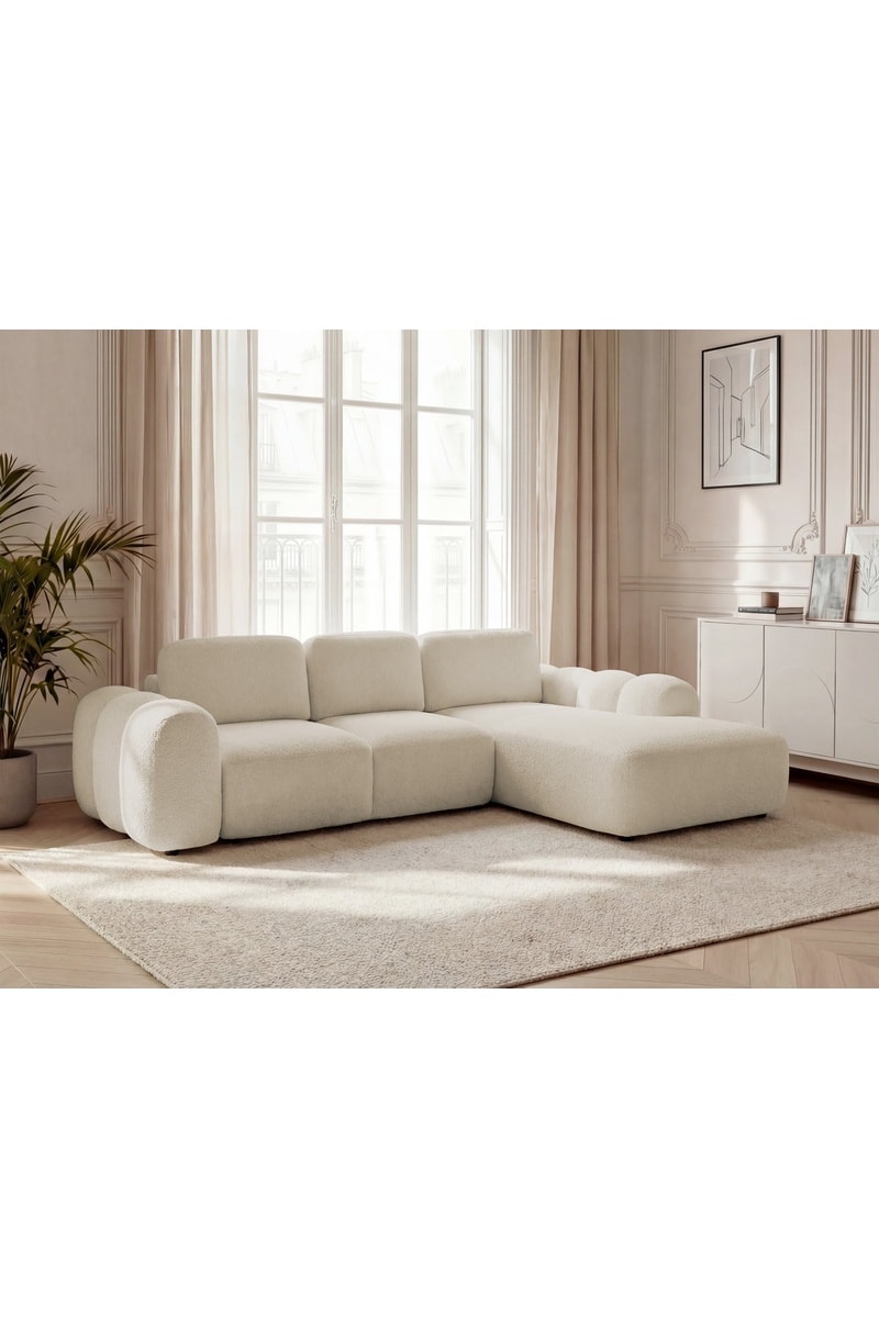 Canapé d'angle droit convertible Montaigne - Beige - 3 places - En tissu bouclette