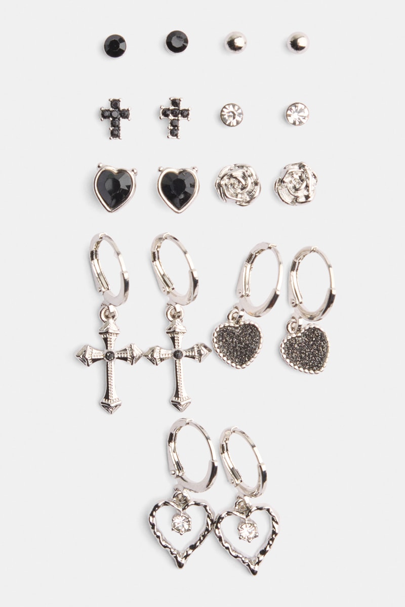6 paires de puce et 3 paires de boucles d’oreilles - Argenté et noir
