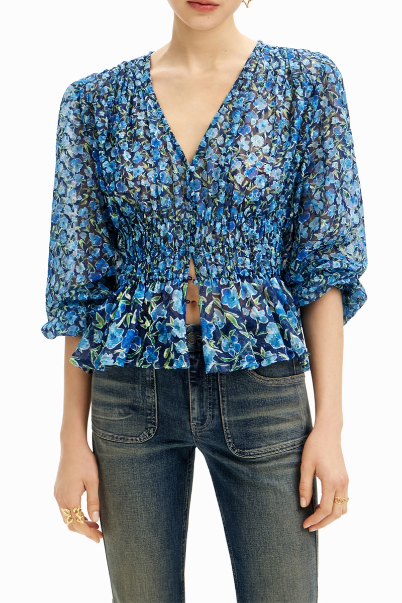 Blouse à manches longues bouffantes élastiques.