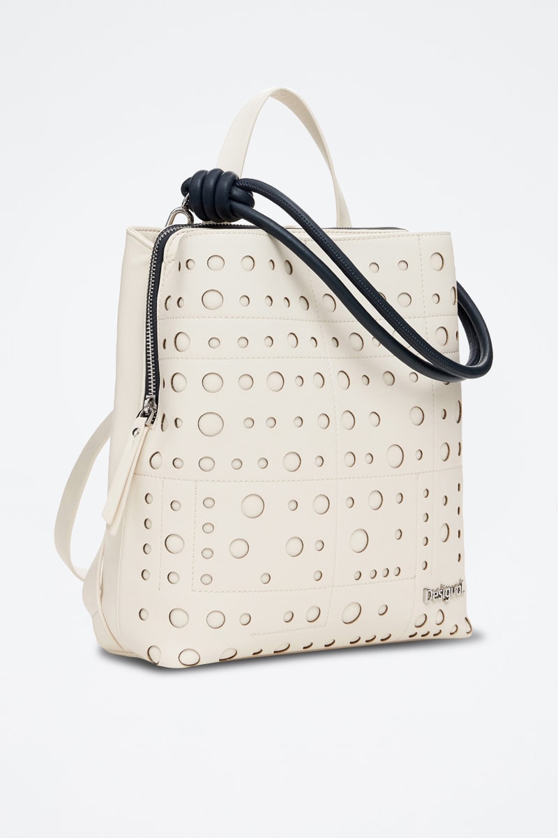 Motifs à pois en relief et logo métallique devant.
