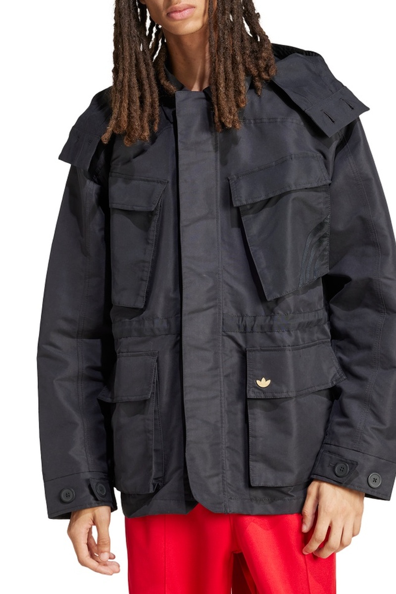 Veste à capuche boutonnée avec liens de serrage et barillets.