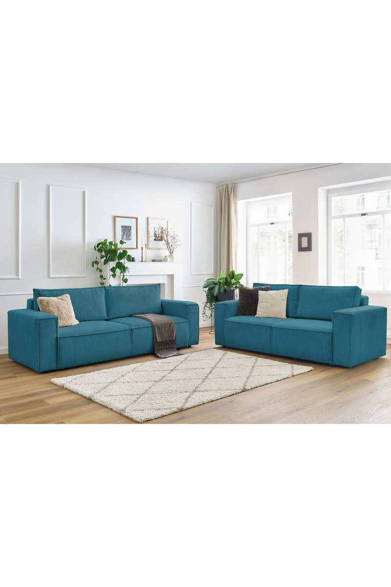 Ensemble canapé droit fixe Nihad - Bleu foncé - 3 et 2 places - En velours côtelé