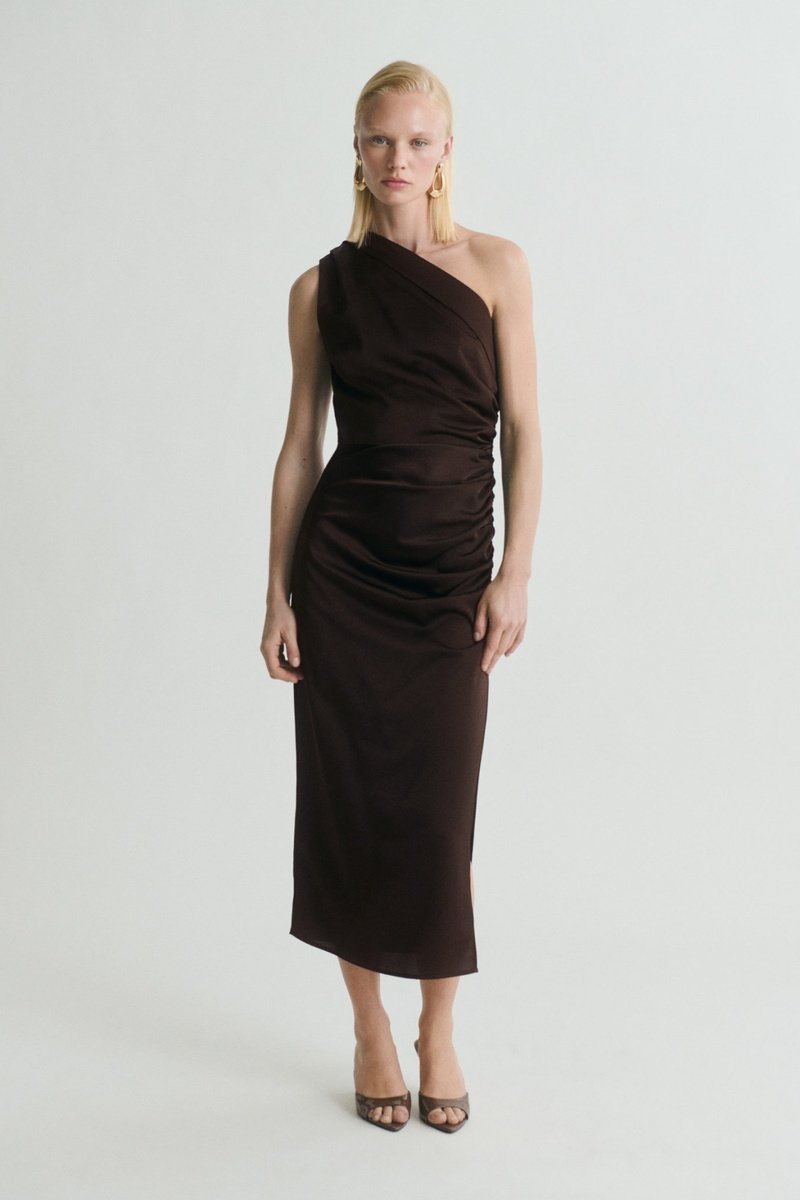 Robe asymétrique satinée avec fronce latérale - Marron