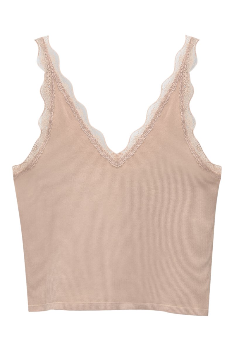 Dentelle à l'encolure et sur les bretelles.