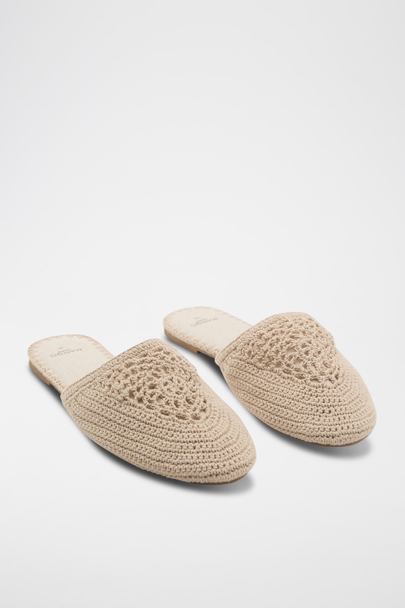 Ces mules affichent un design élégant et artisanal, parfaites pour des moments de détente ou pour apporter une touche originale à un look casual. La doublure et la semelle intérieure sont réalisées en 100 % coton, pour une sensation douce, confortable et respirante. L'empeigne est également en coton, avec une finition crochetée qui lui confère un aspect délicat et fait main. La semelle est en caoutchouc thermoplastique, garantissant durabilité, souplesse et bonne adhérence. Ces mules sont ouvertes à l'arrière, laissant le talon découvert, pour un enfilage facile au quotidien.
