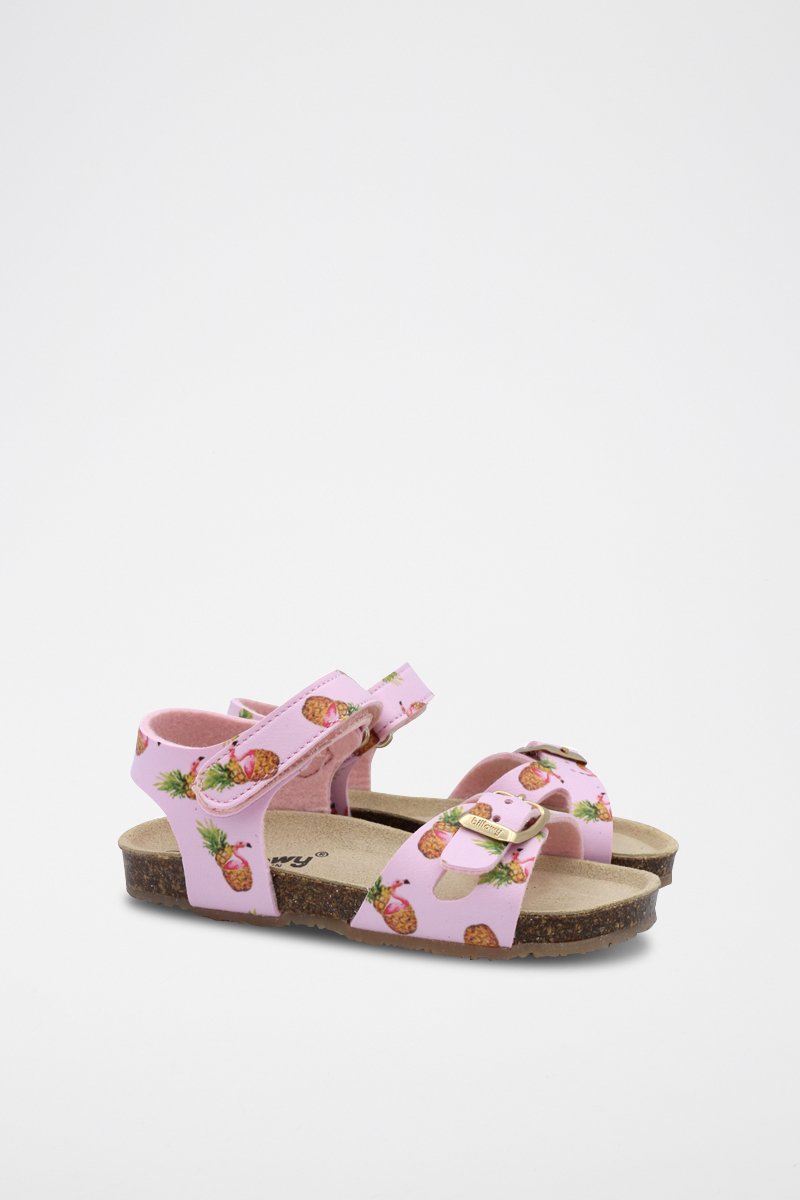 Fermeture par bride à boucle devant et par scratch sur le côté.