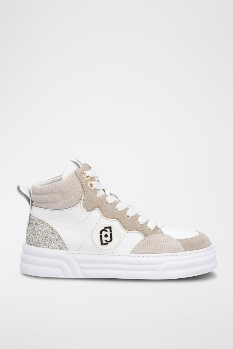 Sneakers montantes en cuir plateformes Cléo - Blanc, doré et gris