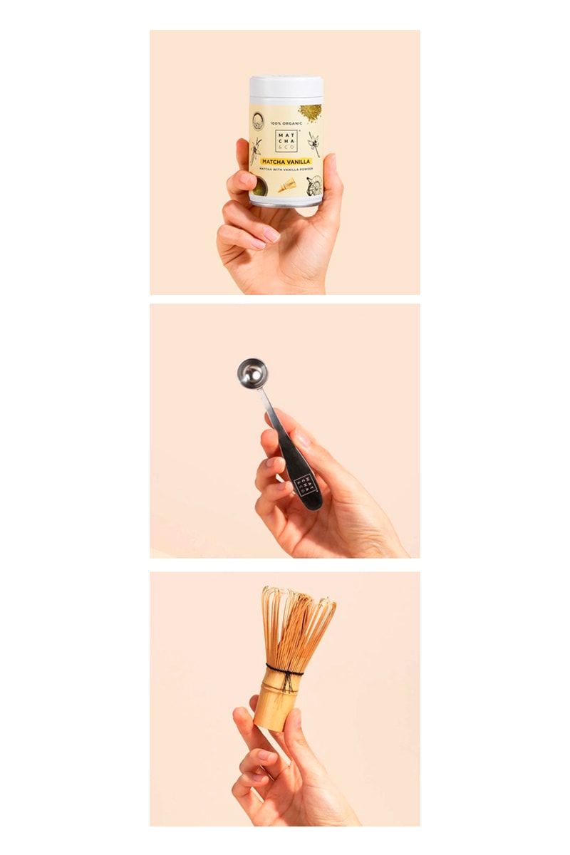 Thé Matcha Vanille, Cuillère doseuse en acier inoxydable et Fouet en bambou Chasen - 80 g