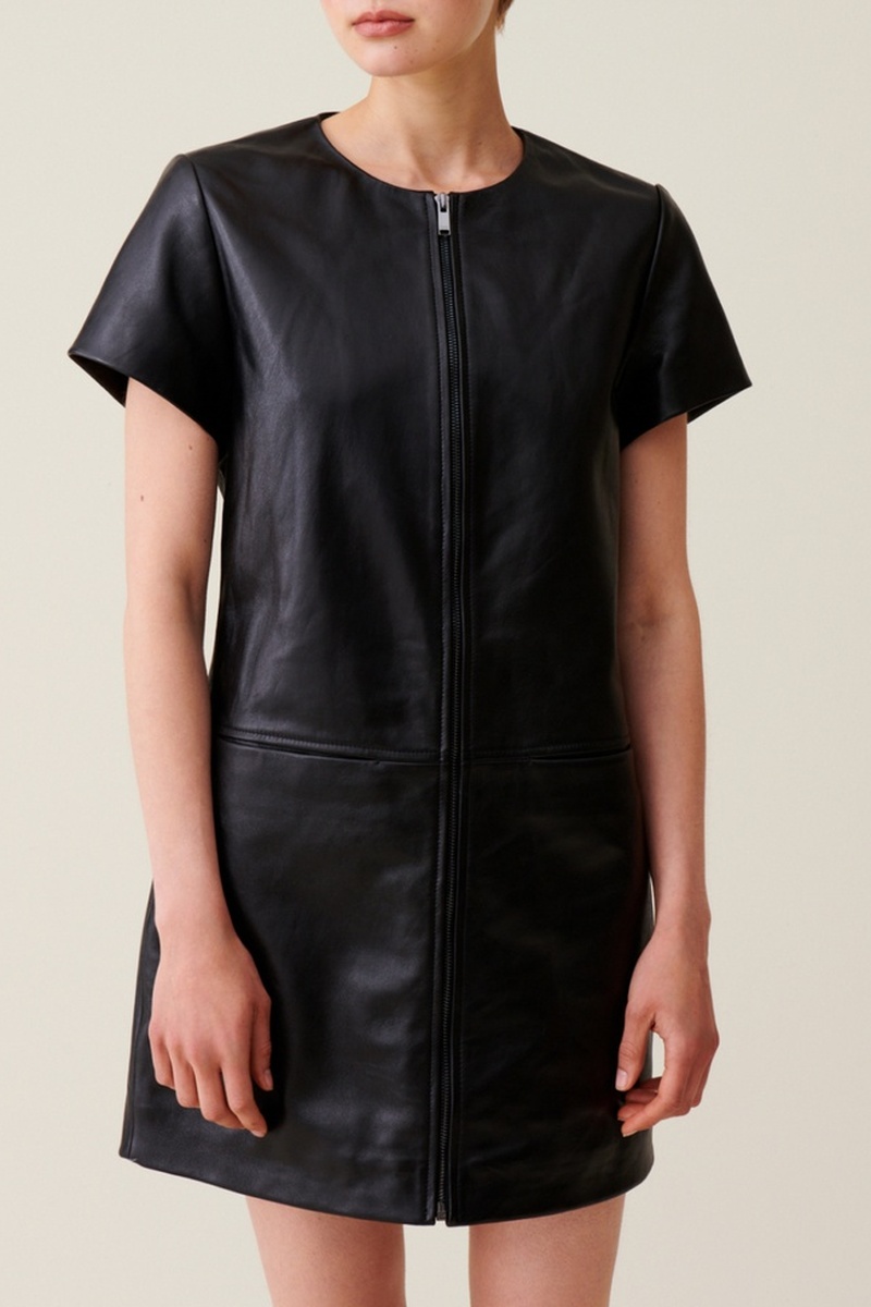 Robe droite en cuir à manches courtes.