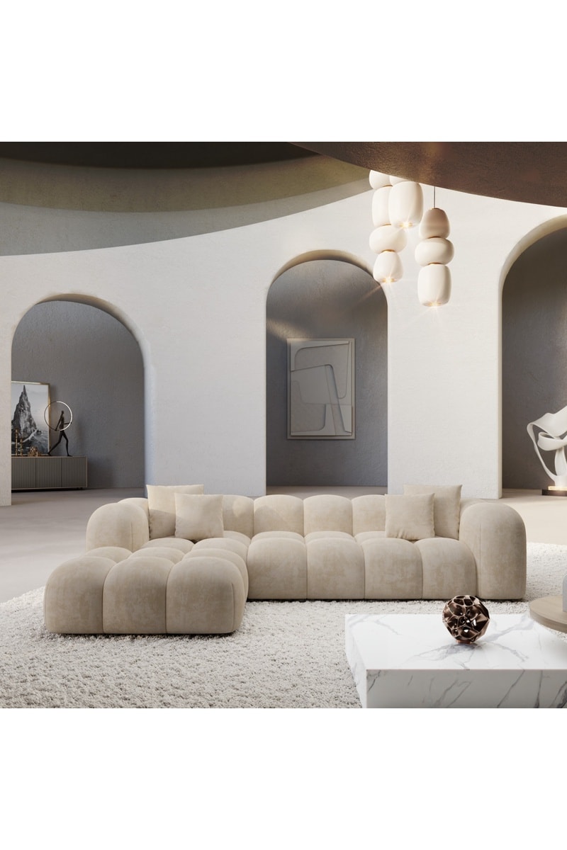 Canapé d'angle gauche convertible - Crème - 5 places - En tissu velours