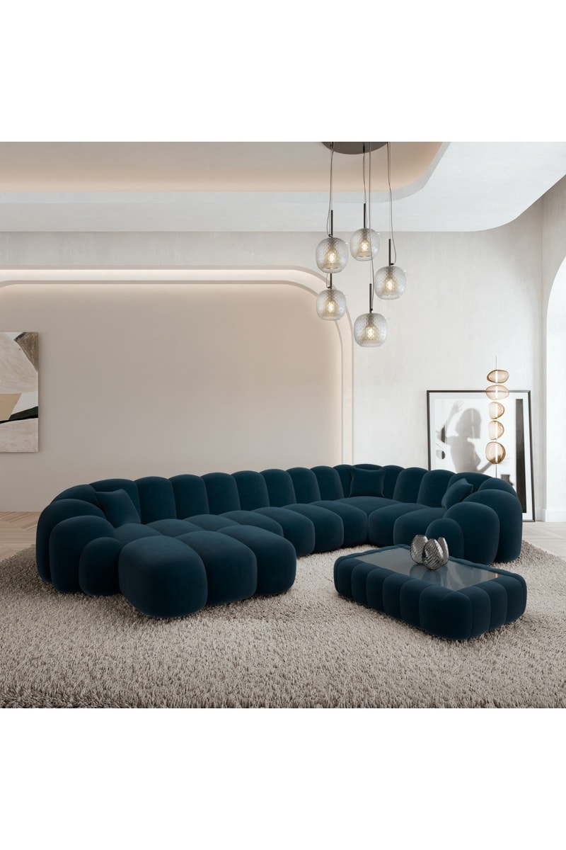 Canapé d'angle gauche panoramique - Bleu nuit - 7 places - En tissu velours