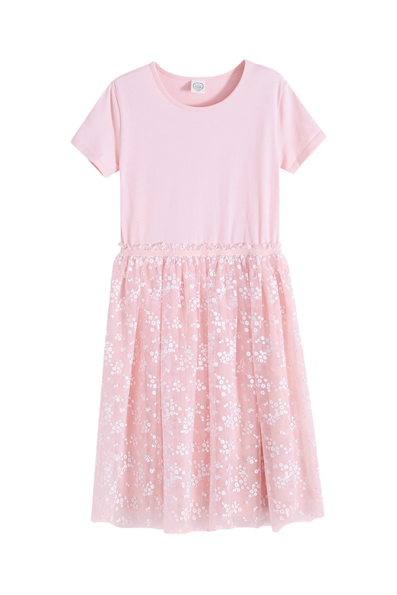 Motifs fleurs sur la jupe.