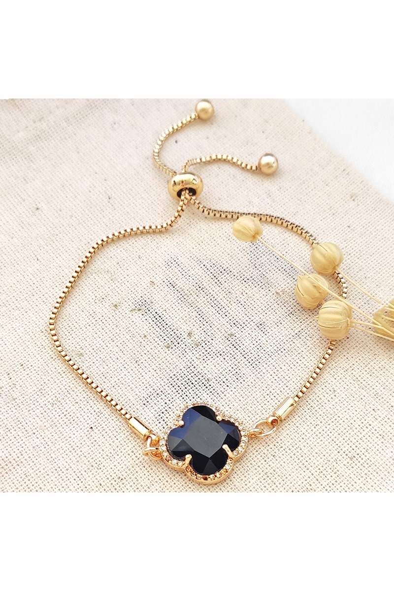 Craquez pour ce bracelet en laiton plaqué or, avec un détail en forme de trèfle noir orné de pierres de Ceylan ! Il apporte une touche d'élégance à votre poignet.