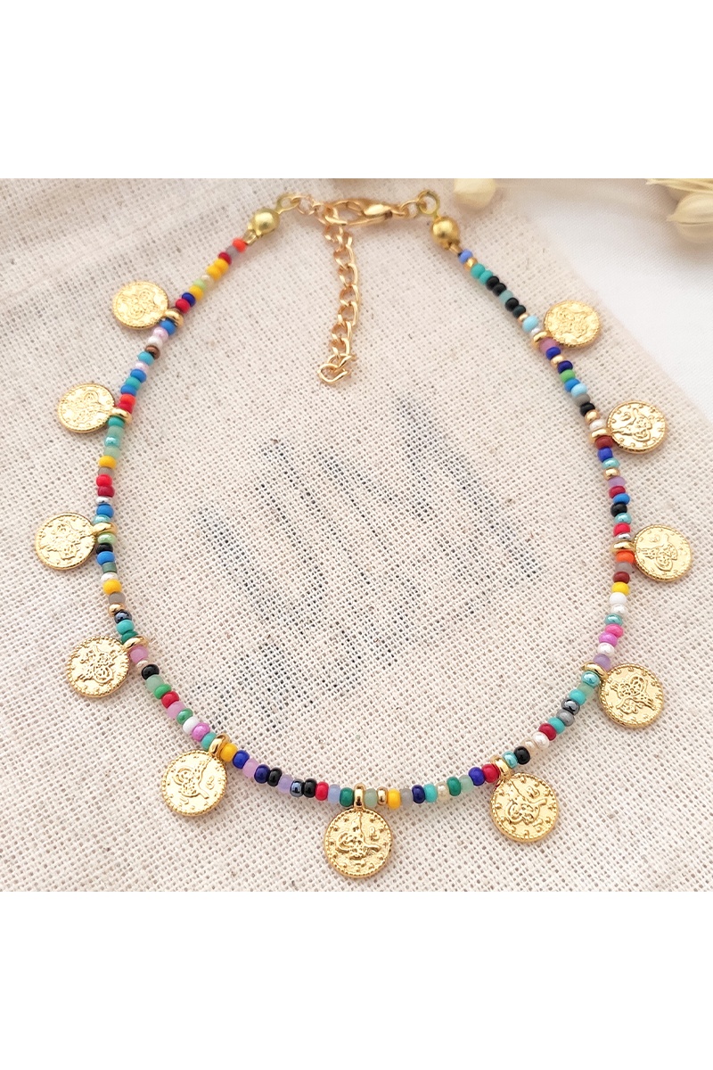 La chevillère en laiton plaqué or avec des perles Miyuki et un pendentif en forme de vieille pièce est parfaite pour ajouter une touche vintage et artisanale à votre look. Idéale pour les journées ensoleillées, elle offre une élégance discrète et bohème.