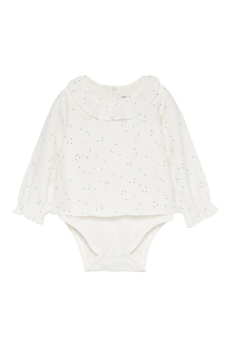 Fermeture pressionnée à l’entrejambe et boutonnée au dos.