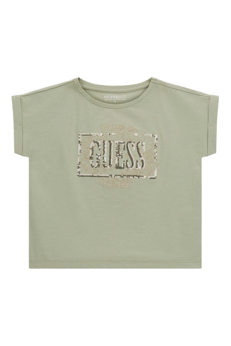 Lettrage, motifs fantaisie et logo à sequins devant.