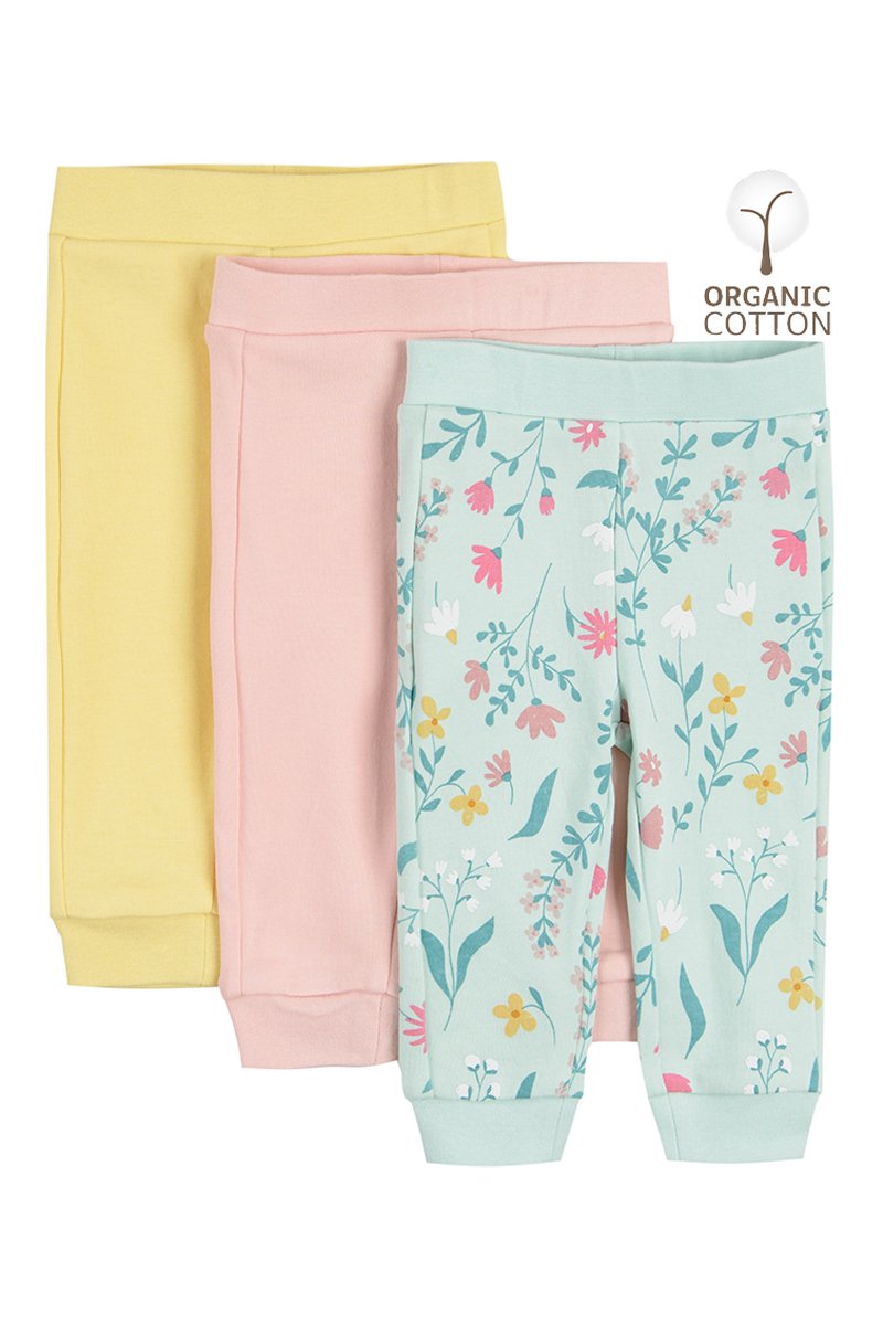 3 joggings en coton biologique dont 1 à motifs fleurs.