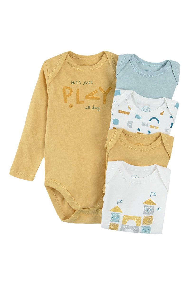 5 bodys dont 1 avec lettrage devant, 1 à motifs fantaisie et 1 avec lettrage et à motifs fantaisie devant.