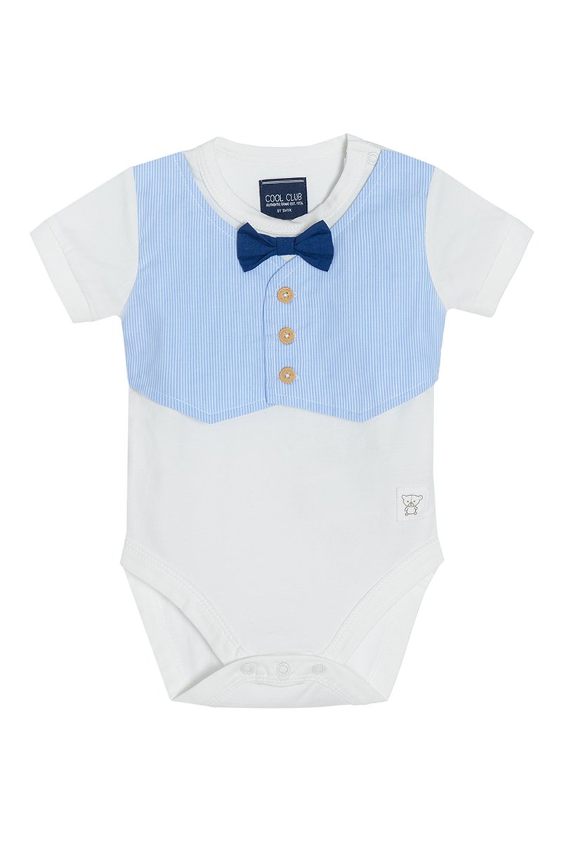 Nœud, boutons décoratifs et empiècement avec logo devant.