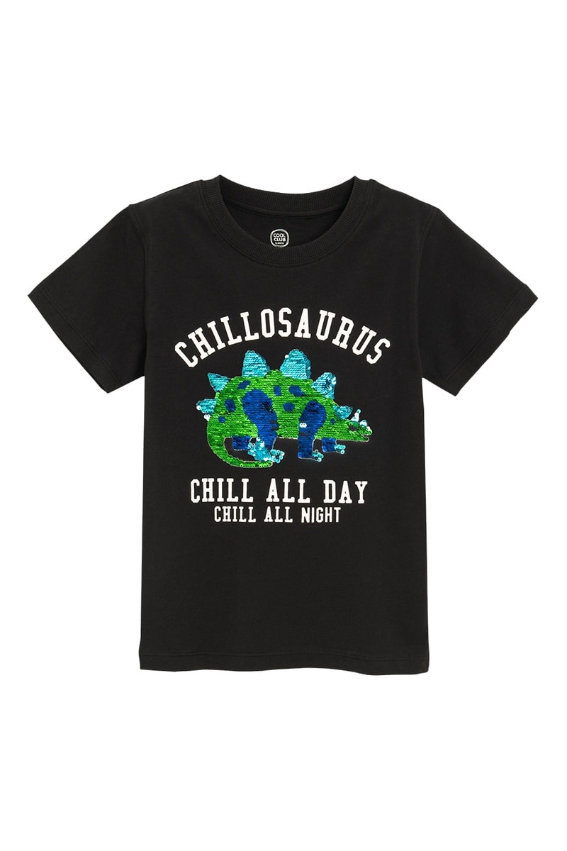 Motif dinosaure à sequins avec lettrage devant.