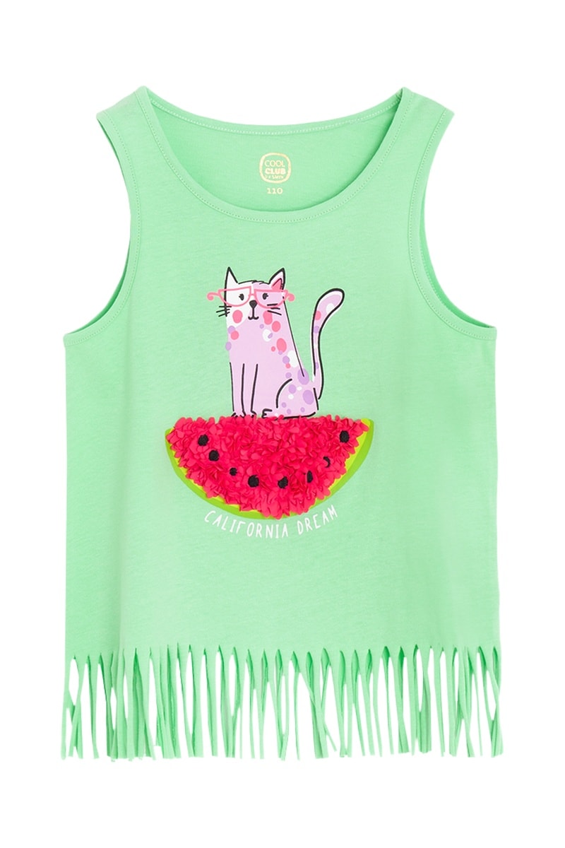 Lettrage, motifs fantaisie et empiècements forme pastèque devant.