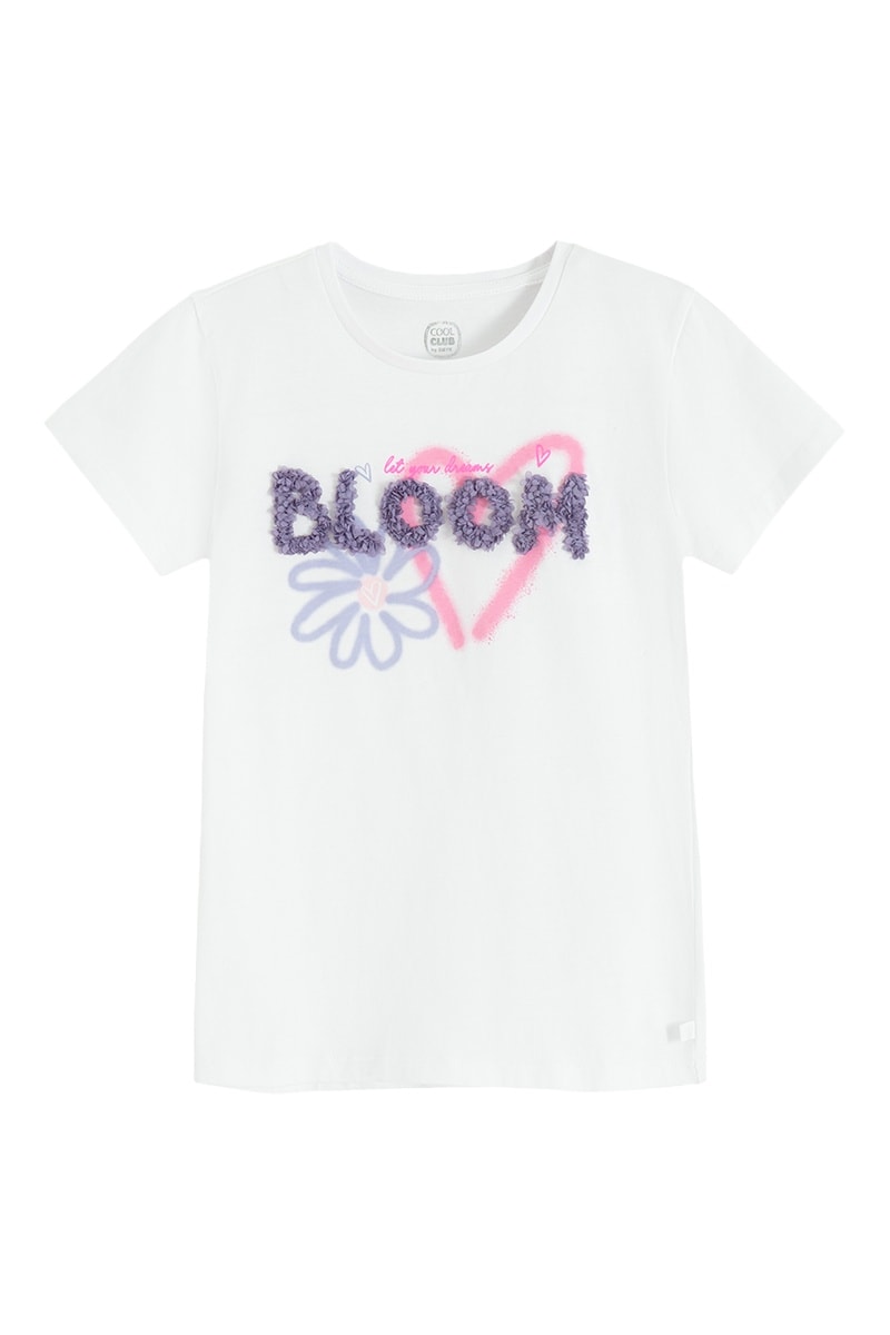 Lettrage, motifs fantaisie et empiècements contrastants devant.