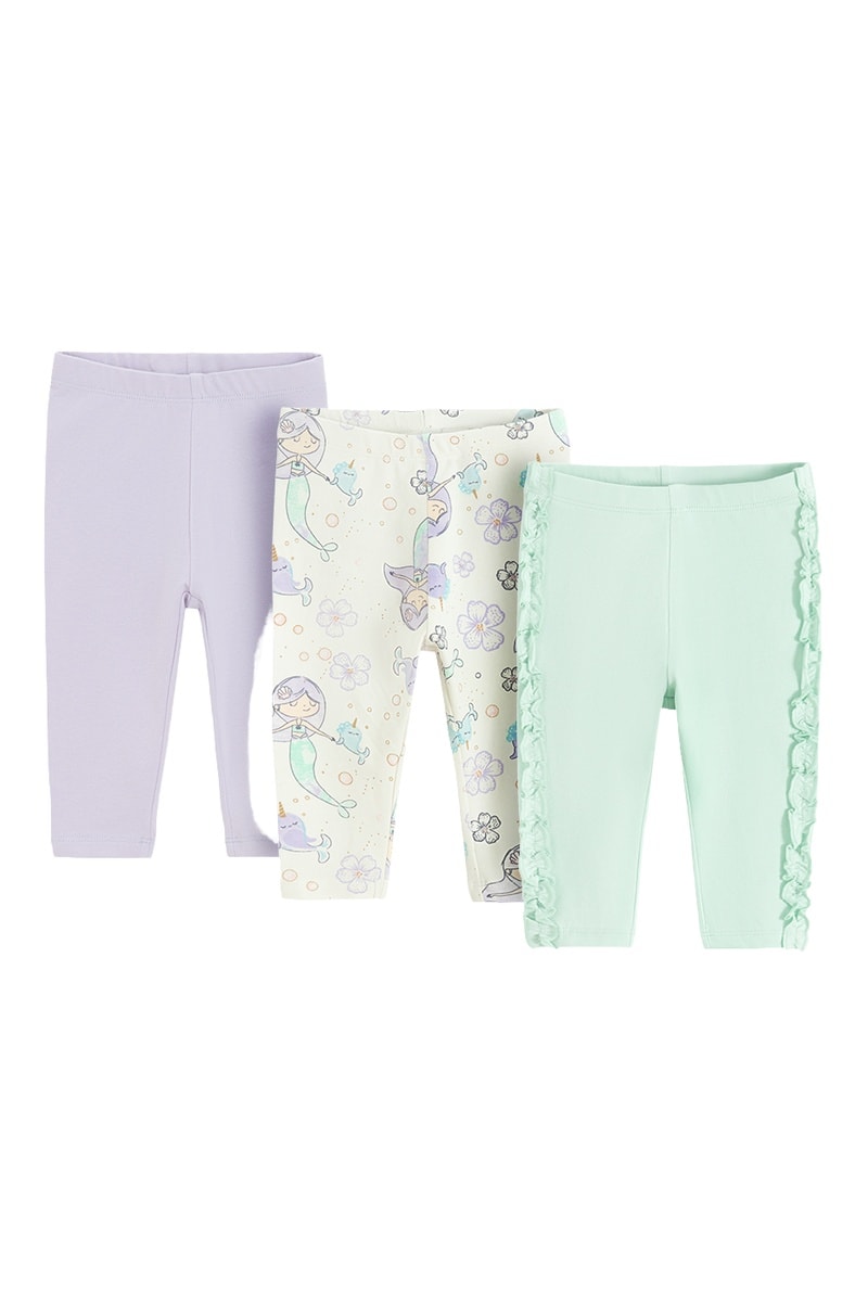 3 leggings dont 1 à motifs fantaisie et 1 avec volants sur les côtés.
