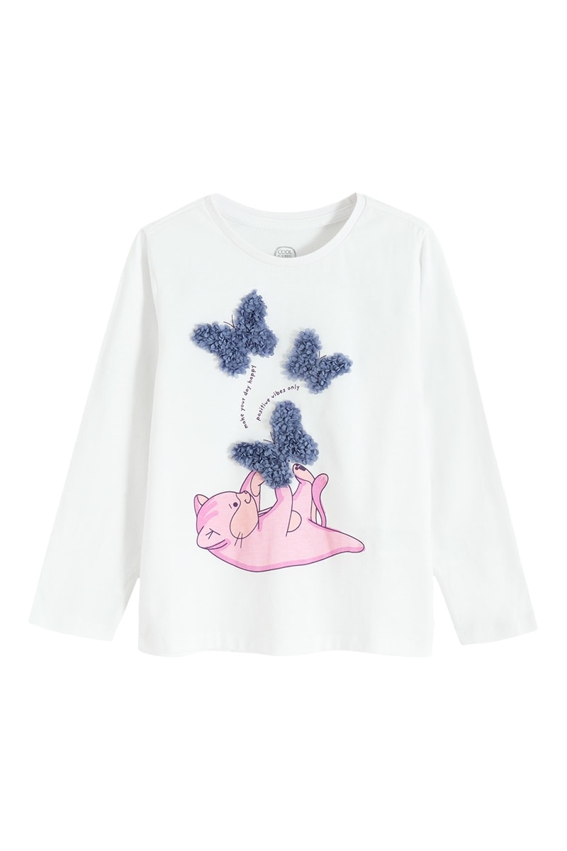 Lettrage, motifs fantaisie et empiècements à motifs papillons devant.